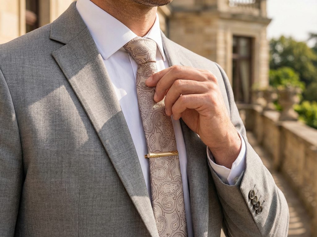 Подходяща е за светлосив, кремав или пясъчен костюм. Бяла риза ще подчертае чистотата на визията, а светлокафяви обувки ще създадат хармоничен, завършен ансамбъл – особено подходящ за сватба в бохо или природен стил.