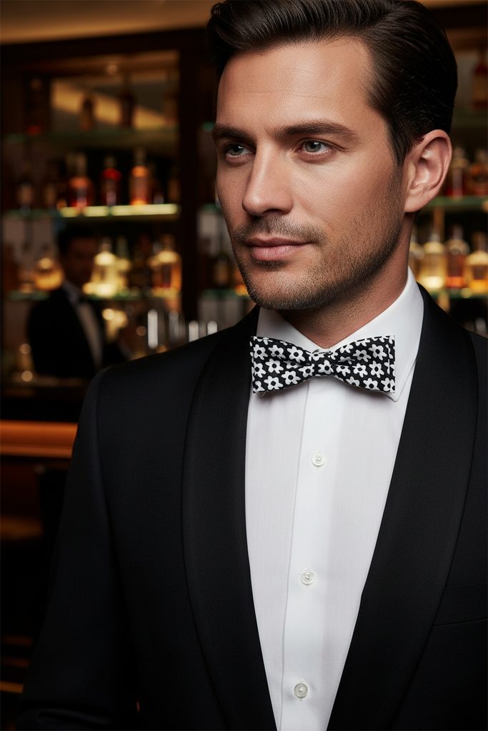 Предварително Черна памучна папийонка с бели цветя, 10см 10 см върви перфектно с всеки фрак или смокинг риза. На гърба на папийонката е закачена кукичка с капси, благодарение на което дължината може лесно да се регулира според обиколката на врата ви.
