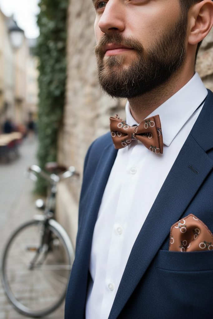 Предварително Кафява папийонка с кърпичка, модел велосипед 12,5 см върви перфектно с всеки фрак или смокинг риза. На гърба на папийонката е закачена кукичка с капси, благодарение на което дължината може лесно да се регулира според обиколката на врата ви.