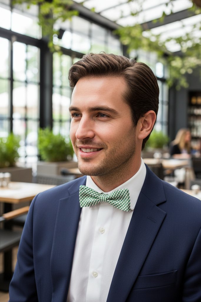 Предварително Премиум памучна папийонка, зелено-бяло кубче 12,5 см върви перфектно с всеки фрак или смокинг риза. На гърба на папийонката е закачена кукичка с капси, благодарение на което дължината може лесно да се регулира според обиколката на врата ви.