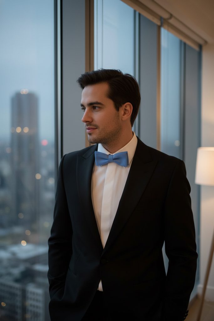 Предварително Светлосиня папийонка Classic 10см 10 см върви перфектно с всеки фрак или смокинг риза. На гърба на папийонката е закачена кукичка с капси, благодарение на което дължината може лесно да се регулира според обиколката на врата ви.