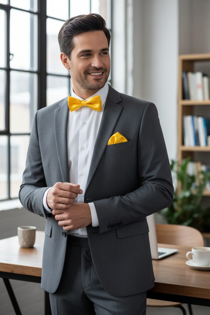 Предварително Жълта папийонка с кърпичка 12,5 см върви перфектно с всеки фрак или смокинг риза. На гърба на папийонката е закачена кукичка с капси, благодарение на което дължината може лесно да се регулира според обиколката на врата ви.